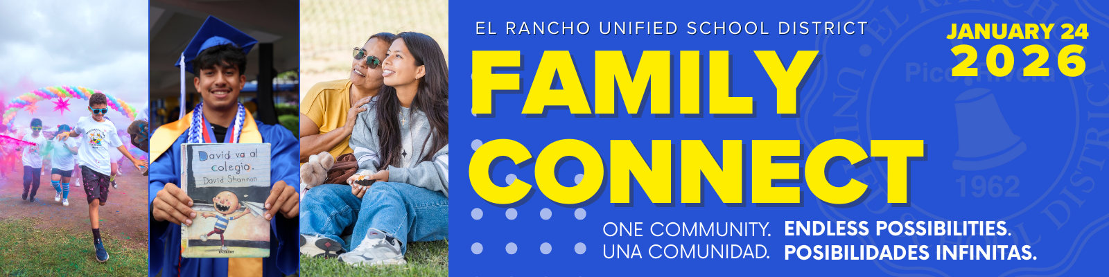 Family Connect 2026 will be held on Saturday, January 24, 2026, from 9:00 a.m. to 1:00 p.m., at El Rancho High School. Families will hear from guest speaker Ovi Vázquez and can join workshops on money and savings, college and career paths, mental health and wellness, and technology tools for the home. There will also be a bilingual workshop for parents of English Learners.
